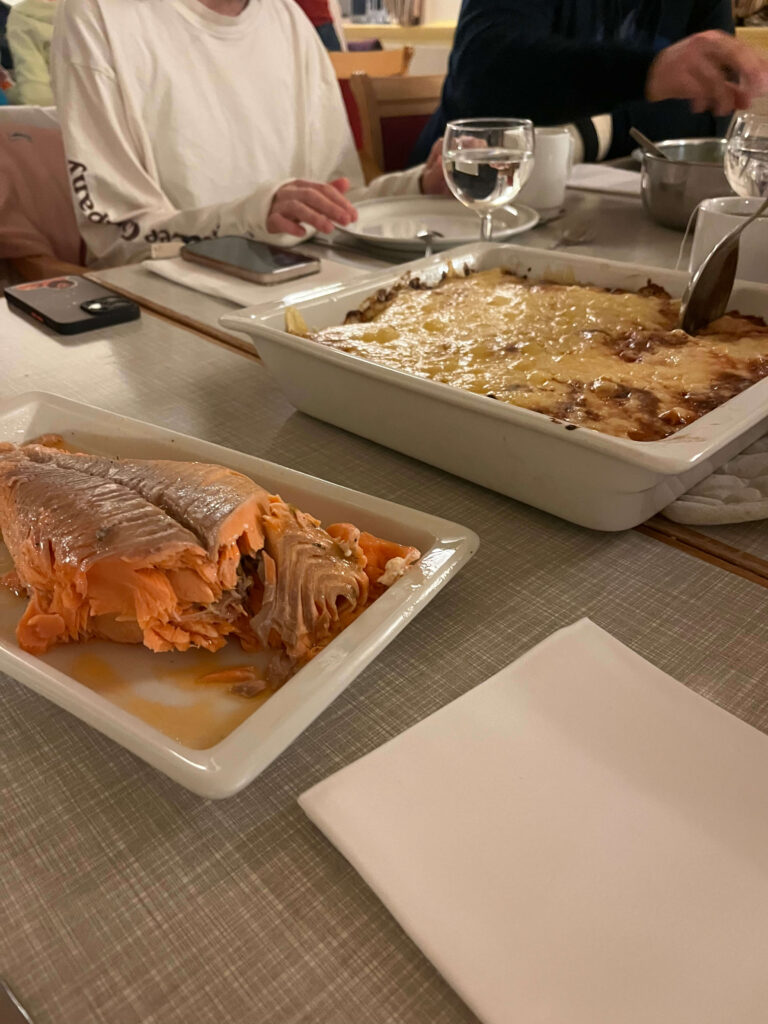 ノルウェーサーモン、レインディアー、なんの野菜かわからんスープ。
