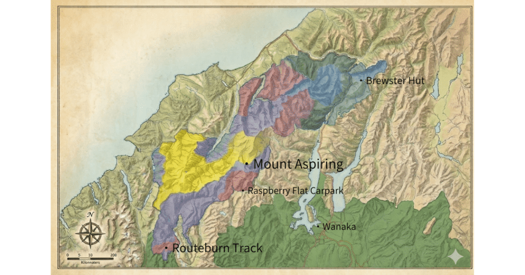 周囲の山々を圧倒するそのピラミッド型の鋭い山容は、まさにこの地域の主。今回は、その偉大な山の麓に位置する Mount Aspiring Hut 周辺、つまり「国立公園の心臓部」に焦点を当てて、その魅力をご紹介します。